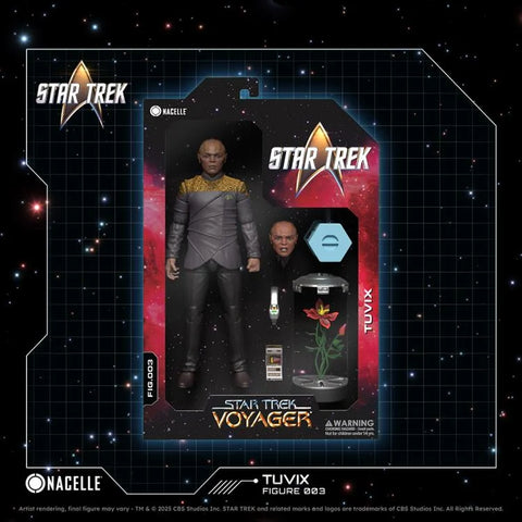 This 1/10 scale, fully articulated figure captures Tuvix’s distinct appearance and personality, from his calm, logical side to his more emotional, conflicted nature. The figure comes with a range of accessories, including his iconic phaser, communicator, an alternative head to reflect his emotional moment on the bridge, a rose in a glass jar, and even the octagonal carrying case Neelix carried at the beginning of the episode. With these accessories, you can recreate some of Tuvix’s most memorable moments from this complex Voyager storyline.